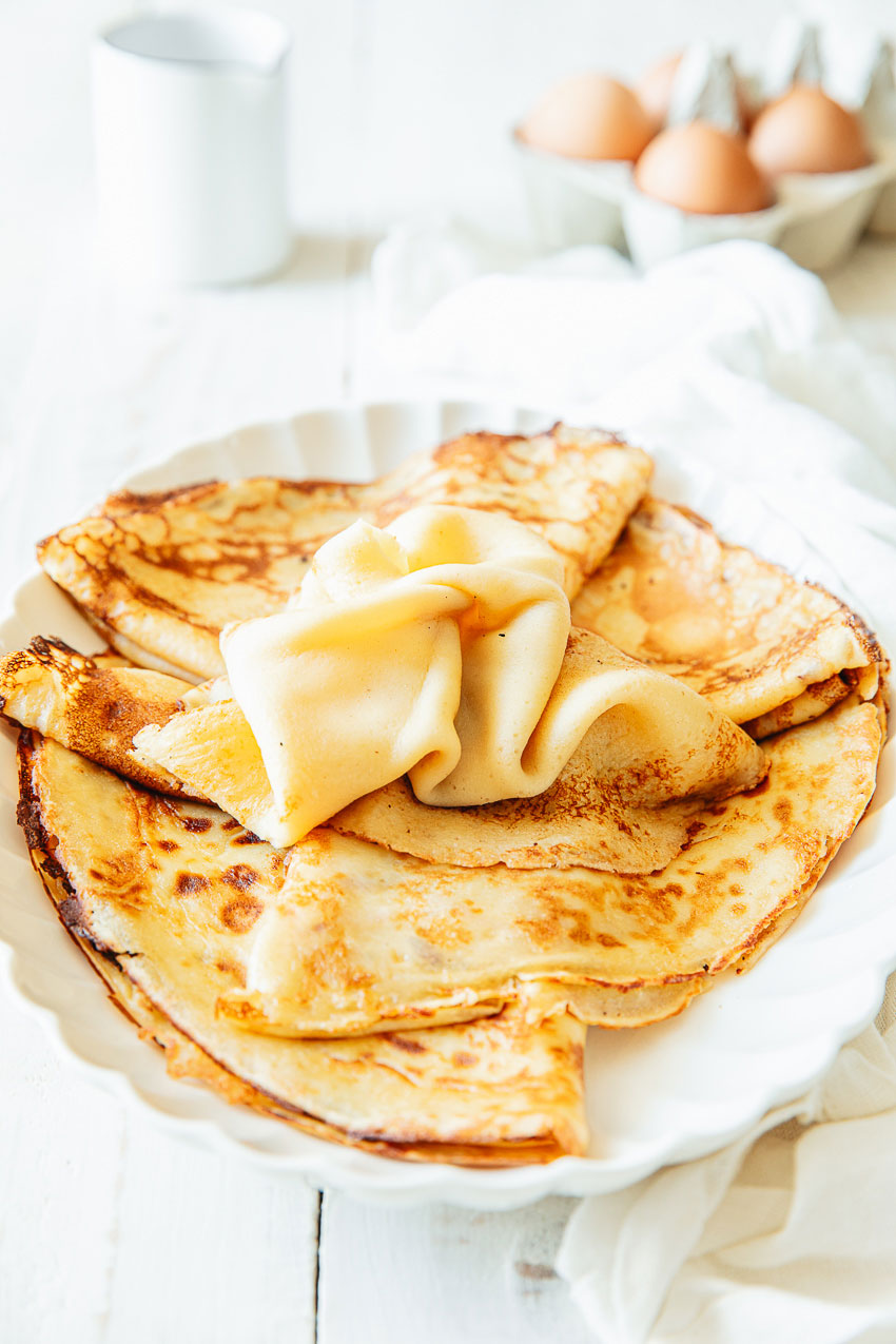 Concernant la recette en elle-même, il vous faudra des oeufs frais, des jaunes d’oeufs, du sucre glace, de la farine T55, du sel, du lait entier et du beurre doux. Christophe Michalak fait un beurre noisette, comme pour des financiers, c’est un détail qui a son importance et qui change vraiment tout. La recette originale est parfumée au Grand-Marnier et aux zestes d’orange, pour ma part, j’ai préféré mettre du rhum brun. Vous pouvez aromatiser la pâte avec ce qui vous plaira, de la vanille liquide, du rhum, de l’eau de fleur d’oranger, de l’eau de rose, …. tout est possible pourvu que ça vous plaise.