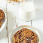 Cookies caramel fleur de sel de Christophe Felder, faits maison, présentés sur assiette en céramique sur fond bois clair